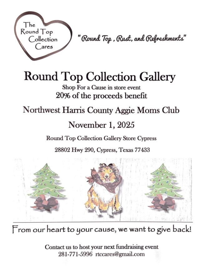 Come shop with us on Saturday, November 1st at the Cypress location. We also need volunteers to help greet customers and tell them about our Aggie Mom Give Back program. Please signup: Round Top Cares Volunteer SignUpGenius